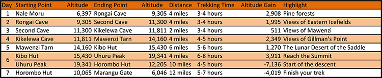 *Note: This route may be modified. It is common to continue to Kikelewa Cave Camp on Day 3 and then spend an extra night at Mawenzi Tarn Camp. The guide will suggest the best option depending on the abilities of the climbers in the group.